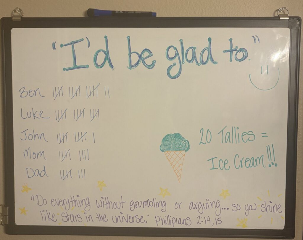 P.S. One of my friends plays this game with a jar with cotton balls. Each family member has a jar with their name on it, and they add a cotton ball to the jar when someone says, “I’d be glad to.” Once a child’s jar is full with cotton balls, they get to make an ice-cream sundae for dessert. Feel free to be creative and try something like this as well. In our home, tallies on a board feel easier, but you can play this game in a variety of ways!